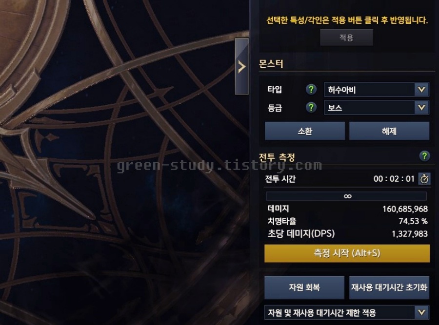 품질 36으로 되어 있는 18강 무기, 모두 5보석을 기준으로 1450레벨로 수련장에서 허수아비 보스를 이용해서 테스트를 해본 결과, 2분 동안 약 1억 6천만 정도의 딜이 가능 했습니다. 초당 데미지(DPS)는 13,27,983이 나왔습니다. 각성기는 사용하지 않았습니다. 부계정이다보니, 카드는 생명력 증가 카드라서 데미지 측정에 영향을 주지 않았습니다. 위의 이미지 처럼 레벨이 낮아서 스킬레벨 12를 만들지 못한 상태에서 측정했습니다.