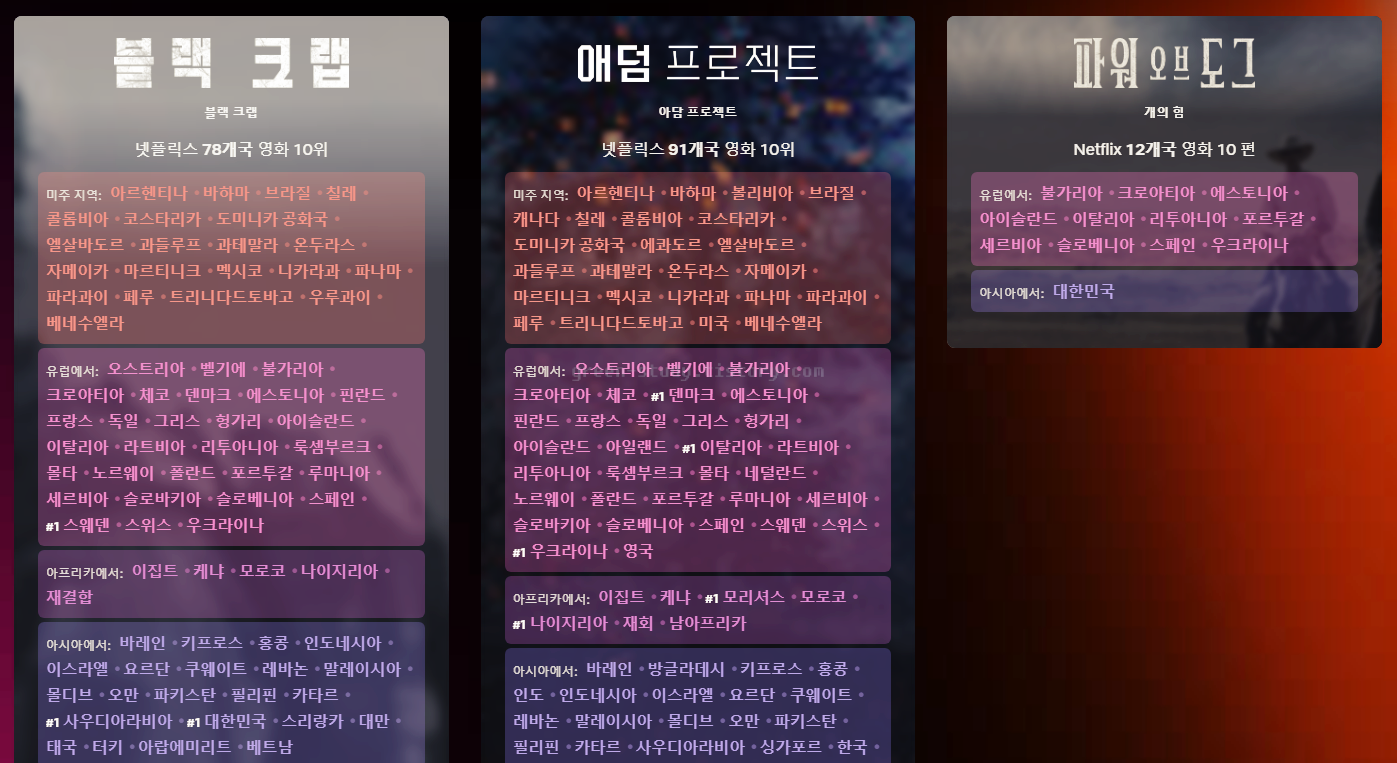 TV 시리즈와, 영화 시리즈 두가지 카테고리로 세분화 되어있고 국가별로 확인할 수 있습니다. 해당 국가 외에도 인기 순위 10위 안에 든 국가의 목록도 확인할 수 있는데요. TV 시리즈에서 한국 로맨스 드라마가 생각보다 인기가 높았습니다.