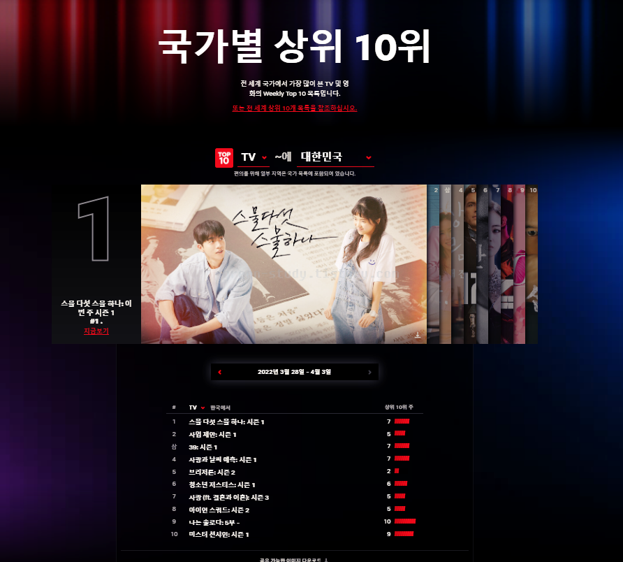 한국 순위는 https://top10.netflix.com/south-korea이 곳에서 확인할 수 있습니다.