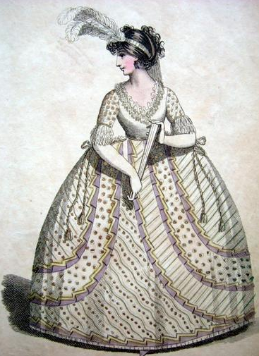 리젠시 시대 귀족 여성의 패션은 가슴을 강조하고, 코르셋을 착용하기는 하지만 치마를 일부러 풍성하게 하기보다는 자연스럽게 내려가는 느낌의 옷입니다.