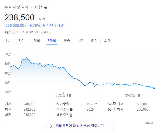 추가로, 기존의 주가 자체가 지나치게 고평가 되어 있었을 가능성도 생각해볼 수가 있을 겁니다. 정확한 정보는 외부적으로 알려져 있지는 않겠지만, 크래프톤의 신작 게임들이 의미 있는 성공을 거두고 있지 않은 것은 사실에 가까운 것 같습니다. 테라와 배틀그라운드의 성공으로 인해서 발전한 게임회사에서 테라를 버렸다는 사실은 외부에서 볼때 주목을 할만한 관점 인 것 같습니다.