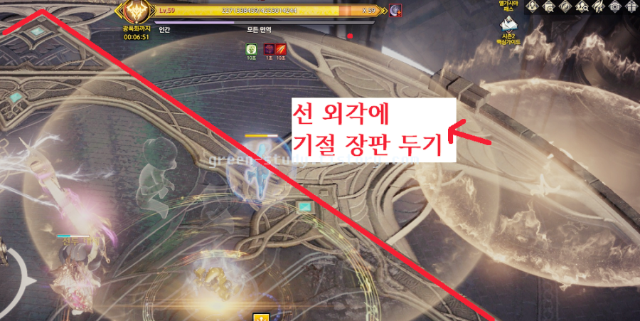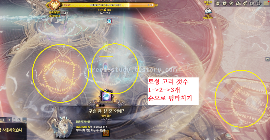 여기까지 끝났다면, 거의 다 클리어가 된 겁니다. 이후에는 표적이 생긴 유저가 마찬가지로 최대한 외각으로 가주시면 됩니다. 마치, 비아키스의 매혹 장판을 떠올리시면 비슷합니다. 다만 스턴이 걸리고 넓은 범위로 공격이 들어오는 것 정도 입니다.