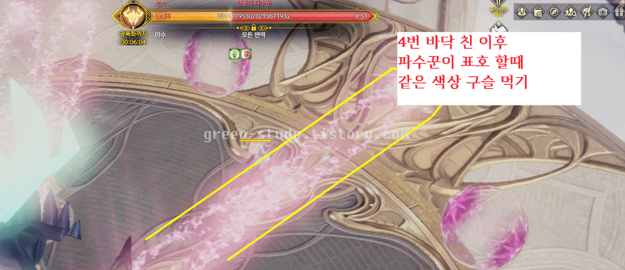 알고 보면 아주 간단한 몬스터입니다. 50줄 쯤에 무력화가 나오게 되는데요. 무력화를 끝내고 천공의 파수꾼 바로 아래 초록색 아니면 보라색(분홍 색) 효과가 나옵니다. 이것을 보고 몬스터 주위에 원 궤적으로 돌고 있는 보라색과 파란색 구슬중에 무엇을 먹을지 결정하면 됩니다. 보라색이면 보라색을 먹으면 되고, 초록색이면 파란색을 먹으면 되는데요.