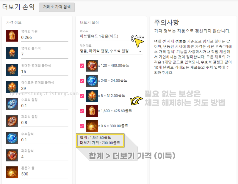 필요한 재화가 다를 수 있기 때문에 반드시 더보기를 하는 것이 좋은지 아닌지 고민이 될 때 유용한 사이트인데요. 가격 정보는 자동 갱신 되지는 않는 사이트이기 때문에 수동으로 최신 가격으로 셋팅해줘야하는 단점이 있기는 하지만 더보기 재료 갯수와 최신 경매장 가격을 정확하게 바로 비교해주기 때문에 직접 계산할 때보다 빠르고 정확합니다.