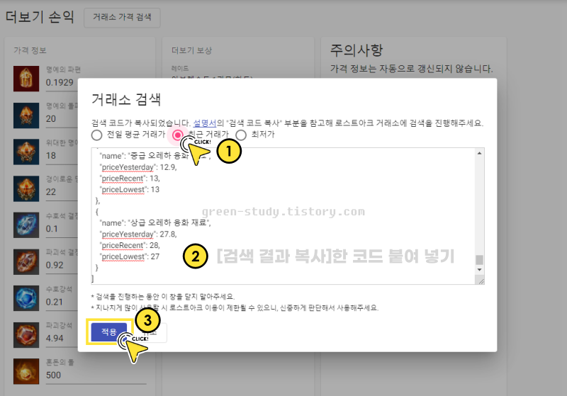 1) 아이스펭 사이트 접속 후 [더보기 손익] 클릭, [거래소 가격 검색] 클릭하기