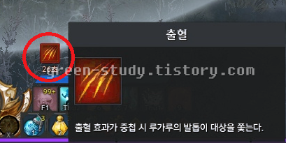 발탄 1관문에서 디버프 출혈 3스택이 쌓이면 유저 중심으로 바닥에 줄이 그어지는 패턴이 발생하는데 체방이 낮은 캐릭터는 버티기 어렵기 때문에 출혈 디버프가 2줄 정도 쌓이면 만능약으로 디버프를 지우거나 정화 스킬 또는 정화 룬으로 대체 가능하지만 챙기는 것이 좋습니다.