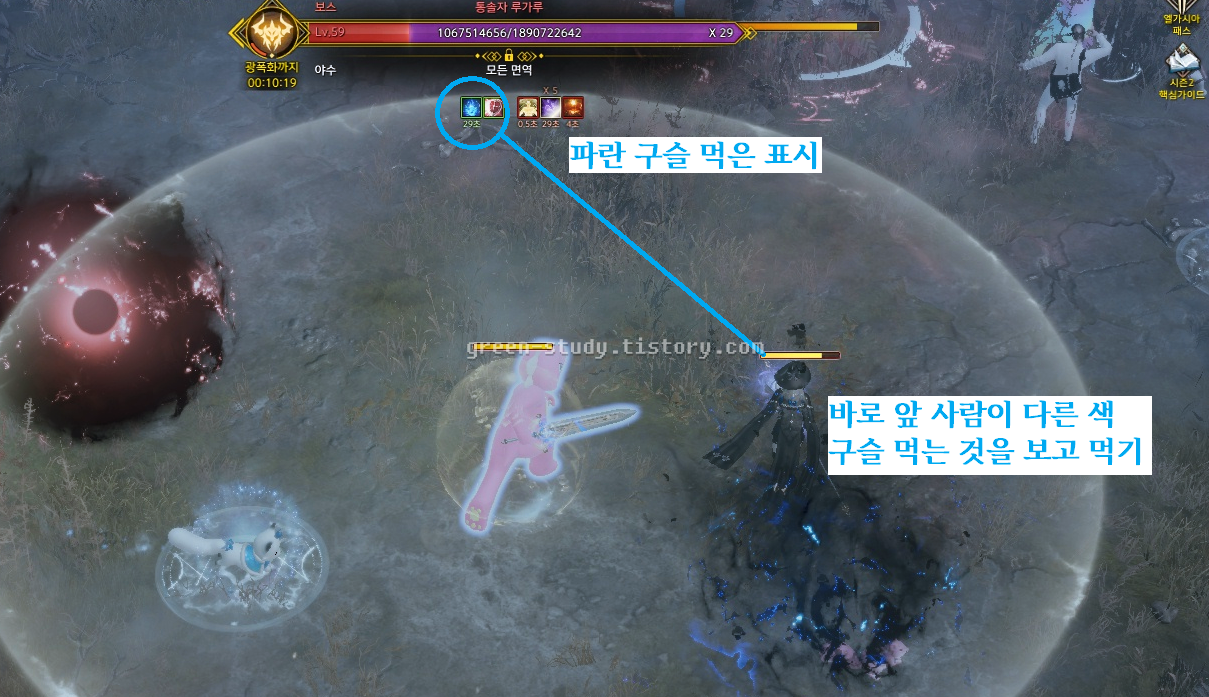 1인 버스 기사라면 빛나는 만능 물약을 사용하여 디버프를 지우고 2초가 디버프 면역 시 빨간, 파랑 구슬을 전부 먹기도 합니다.