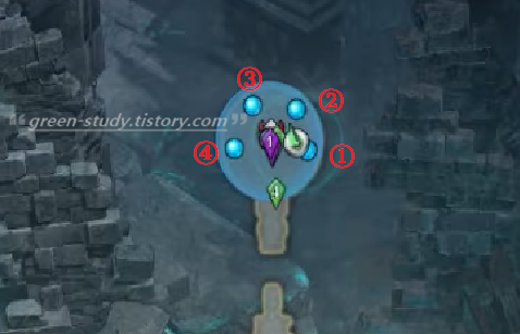 위와 같이 3시→1시→11시→9시 순서로 파괴하여 나오는 구슬인 로나운의 기운을 획득하는 것이 좋습니다. 로나운의 기운이나 바훈투르 버프를 받아야 130줄 전멸기를 피할 수 있습니다.