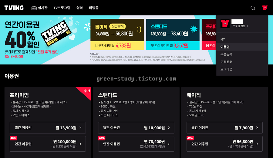 티빙 요금제, 연간 회원권으로40% 할인가로 티빙 싸게 보는 법 후기