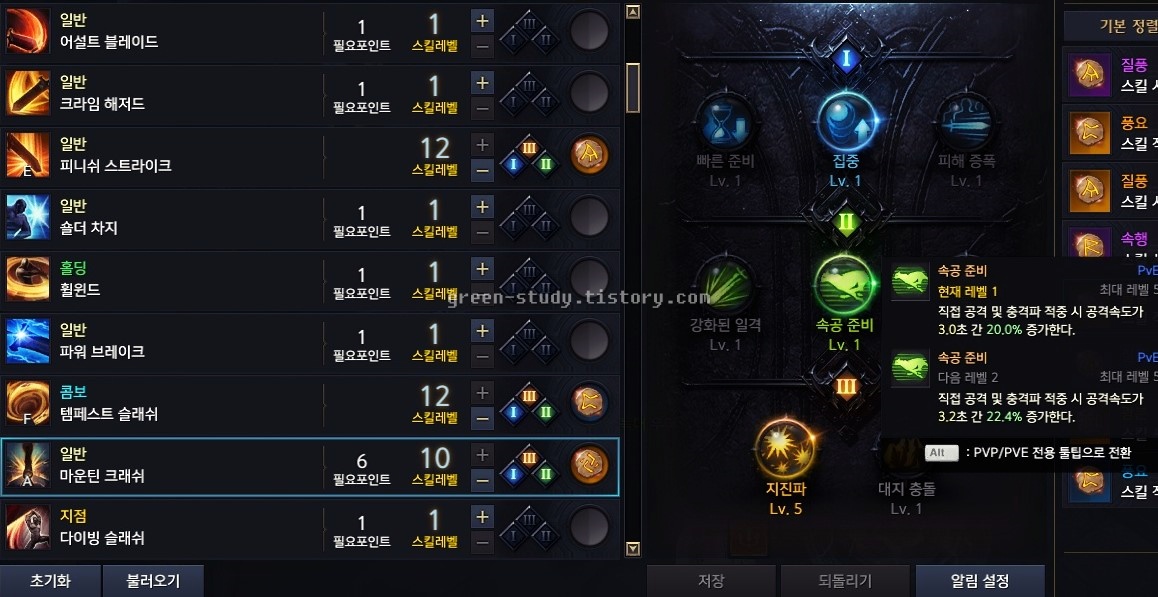 위의 스킬 중에서 피니쉬 스트라이크, 헬 블레이드, 스트라이크 웨이브, 템페스트 슬래쉬를 주요 딜 스킬로 사용하고 있습니다. 마운틴 크래쉬와 체인소드는 공격속도를 순간적으로 끌어 올리는 용도이면서 카운터 스킬 입니다.