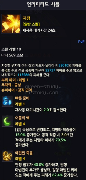 하지만 리턴과 언리미티드 셔플, 운명의 부름과 언리미티드 셔플은 중첩됩니다. 사실 언리미티드 셔플의 데미지가 좋은 편은 아니라서 치명타 피해 77.5% 스킬의 두개 중첩 된다고 해서 좋은 데미지가 나오는 것은 아닙니다. 하지만 여기에 황제 아르카나 핵심 스킬(이보크,다크 리저렉션)을 같이 사용하게 된다면 스킬 데미지가 증가하는 효과를 볼 수가 있게 됩니다.