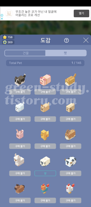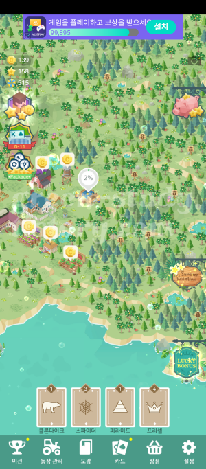 미션 같은 것도 있고, 출첵도 있어서 본격적인 게임같은 느낌도 들었는데요. 코인은 모아서 농장 건설, 카드 수집, 이벤트 등을 진행하는데요. 배경도 귀엽고 펫도 귀엽고 디자인적으로 괜찮았습니다.