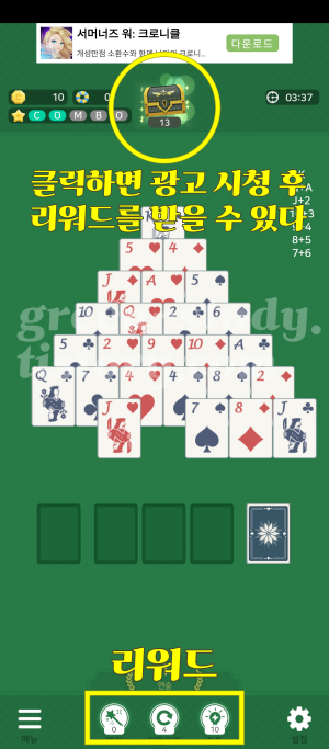 카드 게임을 하다가 중간에 광고를 볼 수 있는 상자 팝업창이 나오는데, 광고를 통해서 모은 리워드로 카드 순서 바꾸기, 추천 선택 카드 보여주기, 되돌리기 3종 스킬을 사용할 수 있습니다. 추천 선택 카드 보여주기나 되돌리기는 다른 카드 게임에서도 찾아볼 수 있는 것이지만, 원하는 카드 위치를 바꿔주는 카드 순서 바꿔주기가 신박했습니다. 이런 스킬이 있다면 사실 계산하는 재미가 반감될 수 있는데, 킬링타임용으로 생각 없이 플레이하기 딱 좋은 아이템이다보니 광고를 계속 보게 되는 이유가 되기도 했습니다.