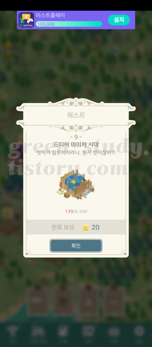 솔테리어 팜빌리지는 지뢰찾기나 카드 게임을 좋아하시는 분이시라면 꽤 재미있게 즐길 수 있는 모바일 게임입니다. 다운 받아서 쉬엄 쉬엄 다른 일도 하면서 약 5시간 정도 플레이하여 퀘스트 8, 퀘스트 9까지 끝냈습니다. 아직까지는 도입부만 플레이한 것이라 완벽하게 이해가 된 상황은 아니지만, 반드시 캐시 템을 사용해야 게임을 진행할 수 있는 종류의 게임은 아니었습니다.