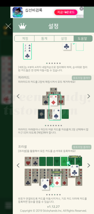 카드 게임 종류는 클론다이크, 스파이더, 피라미드, 프리쉘 4종입니다. 여기서 알고 있던 카드 게임은 프리쉘 정도인데 다른 게임도 꽤 재미있었습니다. 초반 튜토리얼도 친절하고, 게임 방법을 잊어버렸어도 [설정] - [도움말]에서 언제든지 다시 룰을 확인할 수 있습니다.