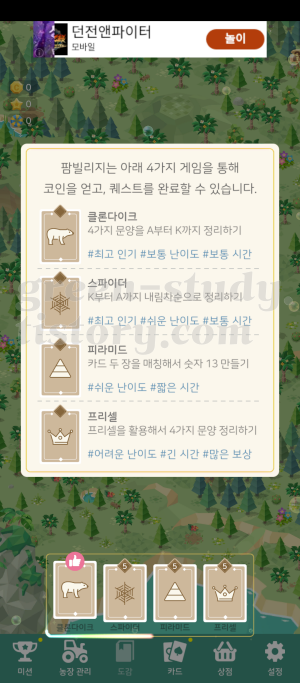 클론다이크, 스파이더, 파라미드, 프리쉘 4종 중에서 개인적으로 프리쉘이 가장 어렵다고 생각이 드는데요. 솔테리어 팜빌리지 퀘스트는 코인만 모으면 자동으로 다음 퀘스트가 진행되는 방식이었습니다.