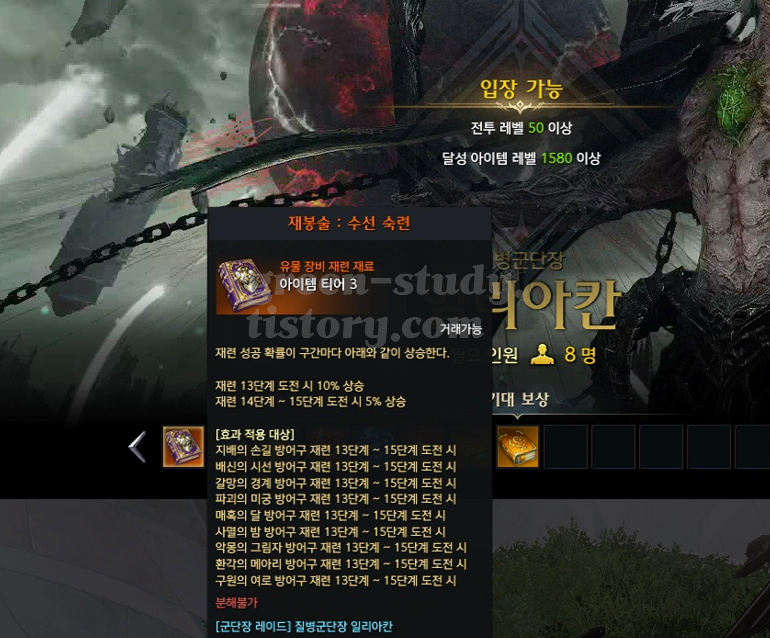 추가로 일리아칸 하드 난이도에서는 16강~17강 4% 상승, 18강~19강 3% 상승 아이템을 획득 할 수가 있는데요. 확률이 낮은 편이여서 가격대가 비싸다면 큰 의미는 없을 것 같습니다. 20강까지였다면 가치가 높았을 수도 있겠지만 19강까지여서 애매하게 나온 것 같습니다.