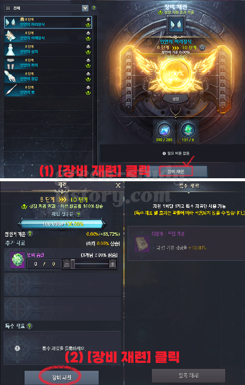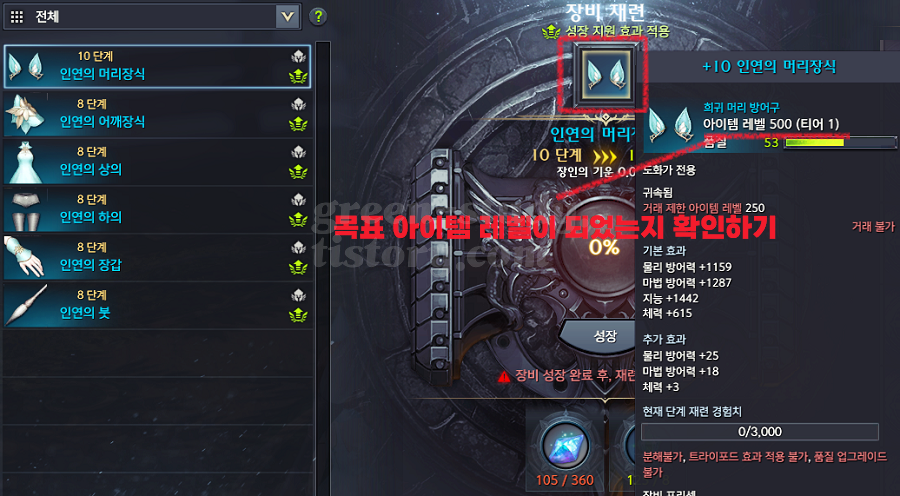 - 1 티어 인연(302 레벨) 장비 8강까지 강화하여 460 레벨 도달