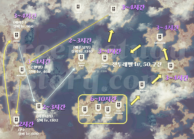 지식전수를 통해 스토리 퀘스트 하는 시간과 대륙 이동은 스킵하고 재련만 하여 장비 레벨 컷을 맞추는 방법도 있습니다. 8시간마다 각 대륙의 스토리를 자동 완료시켜주고, 해당 지역으로 바로 이동이 완료가 되는 구조입니다.