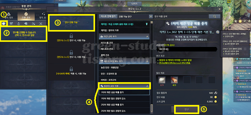 그밖에도 원정대 영지 연구로 재련 성공 확률 및 경험치 감소시킬 수 있습니다.