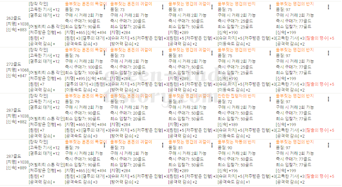 또한 특화를 주로 사용하는 경우 가격대가 높게 형성되어있고, 그 뒤를 이어서 신속, 치명 순으로 가격대가 낮아집니다.