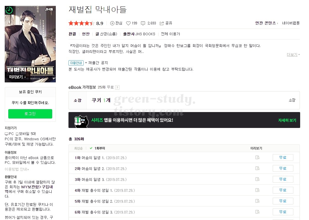 일단 원작 소설은 총 326편까지 있는데요. 25편까지는 문피아와 네이버 시리즈에 무료 공개가 되어있습니다. 카카오페이지는 처음 회차 5편까지 무료로 볼 수 있고 20장은 무료 이용권을 별도로 제공하기 때문에 재벌집 막내아들 원작 소설을 최대한 무료로 많이 읽는 방법은 다음과 같습니다.