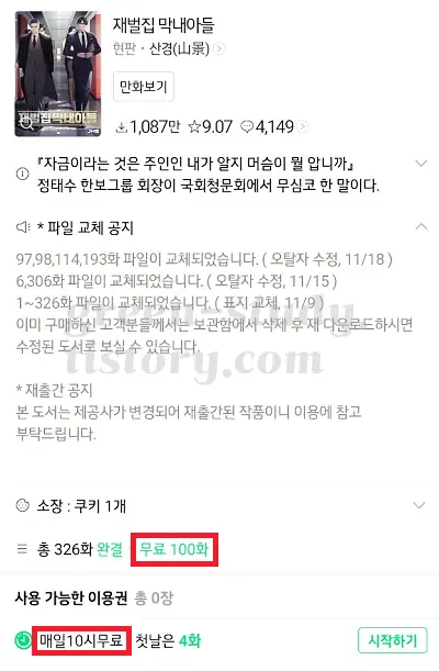 기다리면 무료(기다무)라고 하여 하루 1화씩 무료로 보는 것이 가능하기 때문에 마지막 10화 제외하고 천천히 읽는다면 웹소설을 하루 한 회차씩 읽는 것도 가능합니다. 66화까지 무료로 읽고 남은 회차인 260화를 하루 1 회차씩 읽게 되면 250일 동안 무료 회차 읽고 남은 10회 차는 구입해서 읽을 수 있습니다. 무료로 읽으려면 시간이 꽤나 걸려서 재벌집 막내아들 원작을 드라마 시작 전 미리 읽어보고 싶으시다면 구입해서 보는 것을 추천합니다.