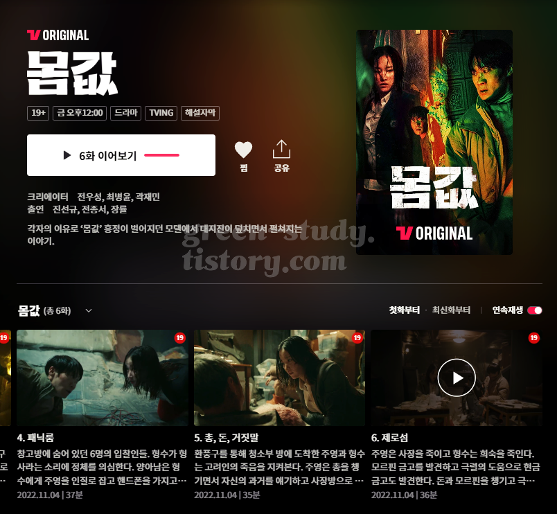 개인적으로 연예인의 인지도를 이용해서 작품을 이끌어 가는 것보다 전문 배우의 몰입감 높은 연기와 잘 만든 스토리를 어필하는 작품을 더 선호하는데요. '몸값'은 기대보다 더 좋은 작품이었습니다. 6화까지 모두 시청한 입장에서 생각해볼 때, 티빙 오리지널 몸값은 넷플릭스에서 볼 수 있는 쟁쟁한 작품들과 비교했을 때 크게 부족하지 않았던 것 같습니다.