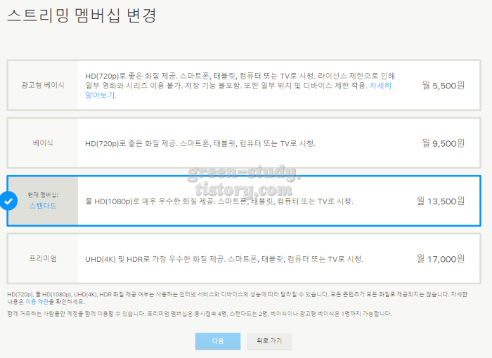 | 스탠다드 | 13,500원 | FHD(1080p) | 1명 추가 가능 |