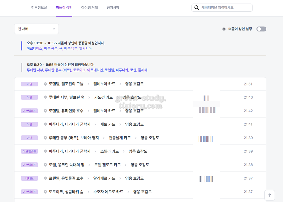 떠돌이 상인 등장 시기에 직접 맵으로 이동해서 확인하는 방법으로 직접 확인할 수도 있지만 유저가 운영하는 로스트아크 떠돌이 상인 공유 오픈 카톡이나 https://kloa.gg/merchant 같은 로스트아크 카드작에서 떠돌이 상인에서 등장한 아이템을 서버별로 확인하면 좀 더 편리합니다.
