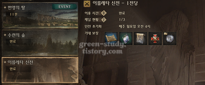 이를레타 신전은 매일 플레이 가능한 던전은 아니고, 주 1회 플레이 가능한 던전입니다. 장비 및 비전서 제작에 필요한 제작 재료와 전직의 서에 필요한 전직의 증표가 드랍이 됩니다.
