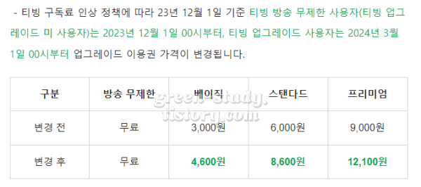 1-5. 네이버 티빙 요금제(무료, 업그레이드 기준) 2023. 12. 1