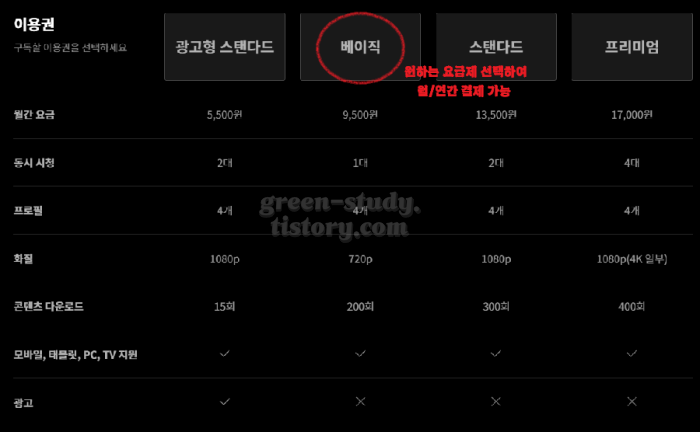 베이직 이하일 경우에는 네이버 티빙 무료(연간, 월간)가 가장 저렴