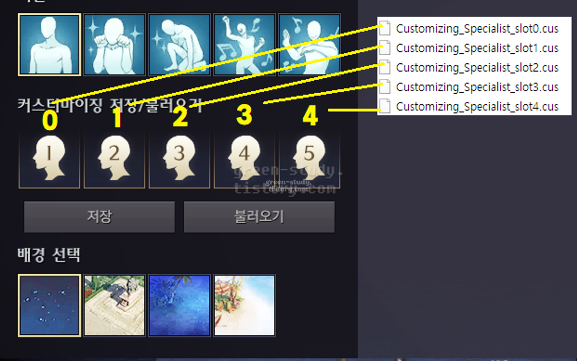 Customizing_직업 이름_slot0~5.cus로 구성이 되어있는데요. 직업 이름은 다음과 같이 분류가 되어있습니다. 스페셜리스트라면 Customizing_Specialist_slot0.cus 이런 식으로 파일 이름이 되어있습니다.