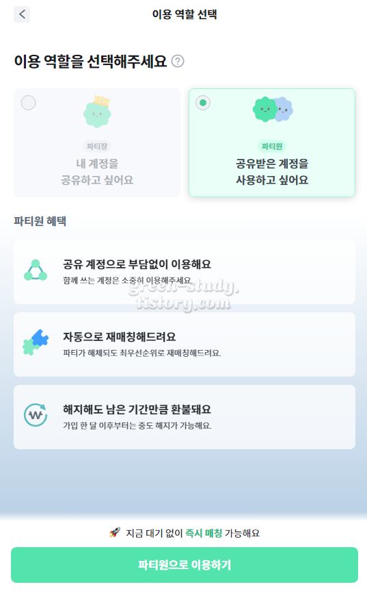 (3) 파티장, 파티원 중에서 원하는 역할을 선택합니다. 저는 [파티원]을 선택하였습니다. 해지해도 남은 기간만큼 환불이 가능한 점이 피클 플러스의 장점입니다. ▼