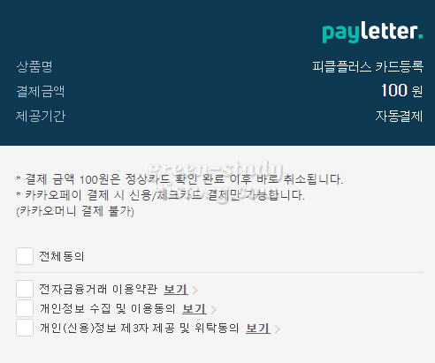 (7) 카카오페이로 선택 후 다음처럼 100원 자동 결제가 먼저 진행됩니다. 카카오톡 카카오페이 QR 코드로 스캔하면 자동 완료가 됩니다. ▼