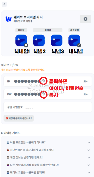 (16) 피클 사이트에서 [My 파티]에서 파티원으로 참여 중인 곳을 확인할 수 있고, 다른 파티원이 나가서 비밀번호가 변경된 경우 다시 접속해서 아이디와 비밀번호를 확인할 수 있습니다.