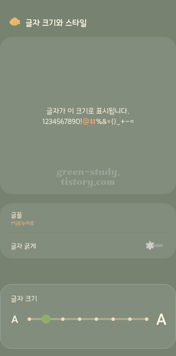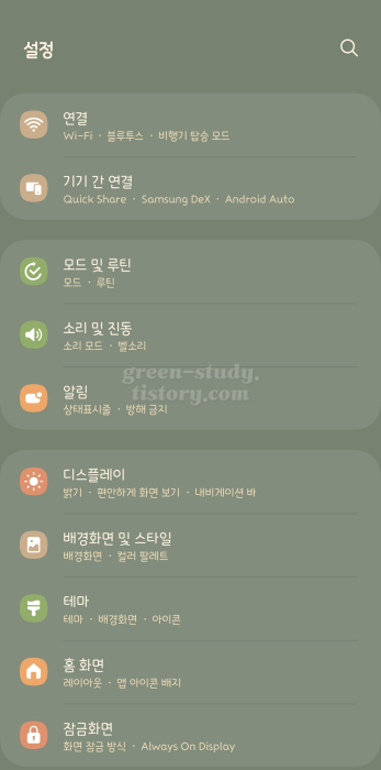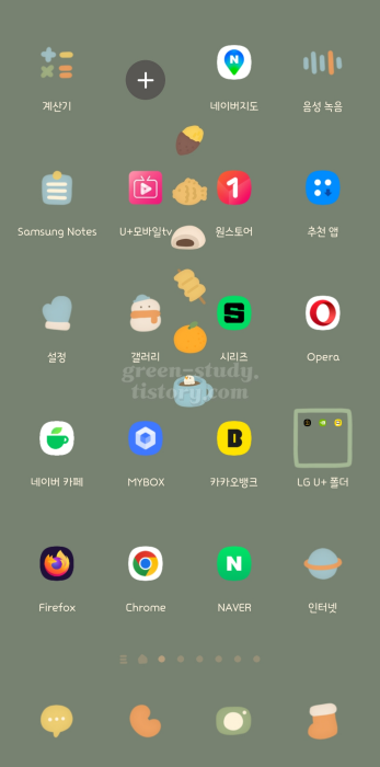 최근 사용하는 갤럭시 테마가 짙은 초록색인 winter Yum-yum mood_khaki (sono io) 테마를 사용하고 있어서 사실 이 테마에는 잘 어울려서 문제가 되지는 않지만 대부분 밝은 색 테마를 사용하는 분들이 많을 거 같아서 이 부분은 아쉬운 분도 계실 거 같네요.